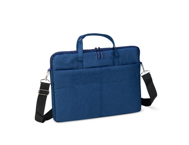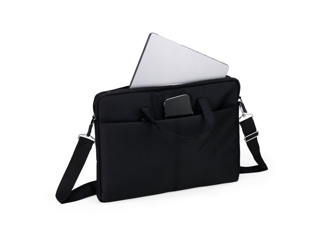 Pasta para notebook em poliéster impermeável, fechamento em zíper e capacidade para dispositivos de até 15,6 polegadas. Possui compartimento principal acolchoado e bolso frontal. Conta ainda com duas alças de mão, duas abas menores para encaixe de alça transversal removível e faixa posterior para acoplar em malas. Acompanha alça transversal ajustável.