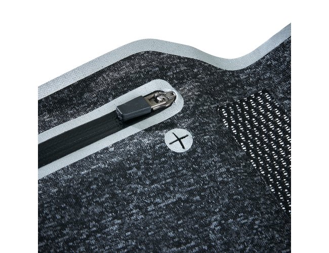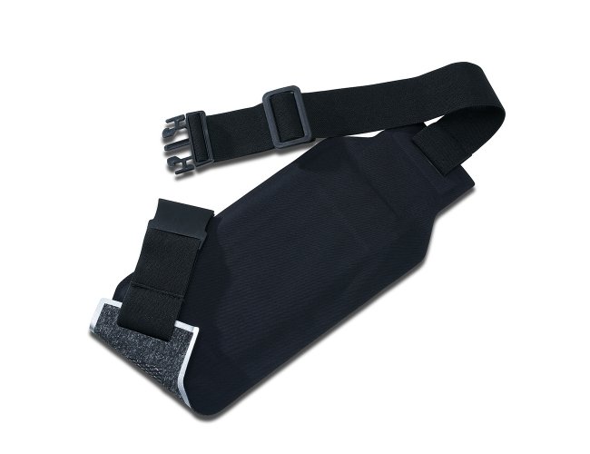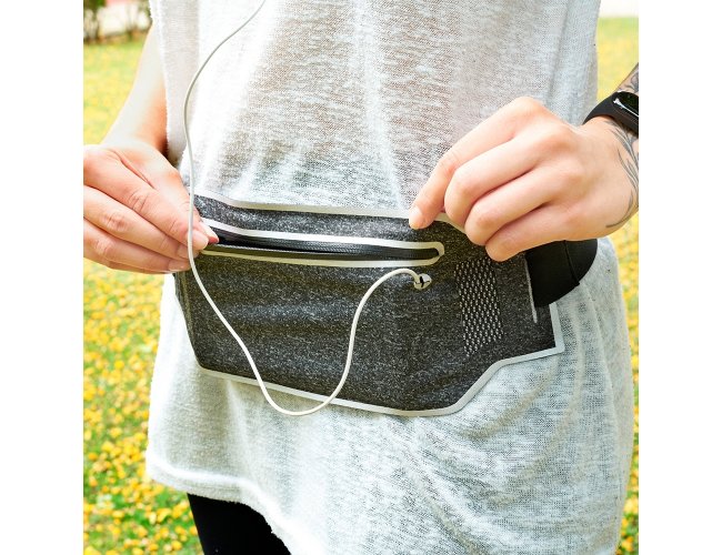Pochete antifurto esportiva. Confeccionada em lycra impermeável, a pochete possui um formato slim que permite a utilização por dentro da roupa sem causar volume, aumentando a possibilidade de não ter seus pertences furtados. Ideal para práticas esportivas, a pochete possui saída para fone de ouvido, cinta elástica ajustável com fivelas, saídas laterais para circulação de ar e contornos reflexivos. Contém um zíper selado que impossibilita a infiltração de água, seu compartimento interno possui uma divisória para separação do celular e itens que possam vir à riscá-los.