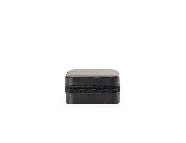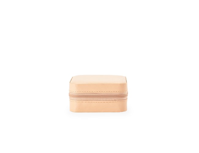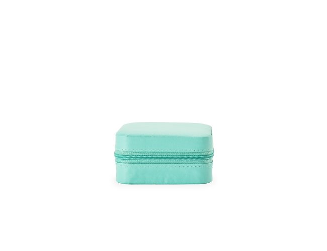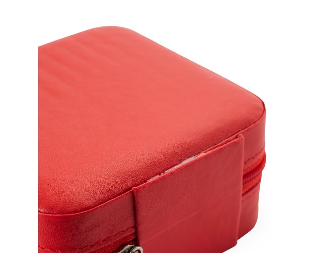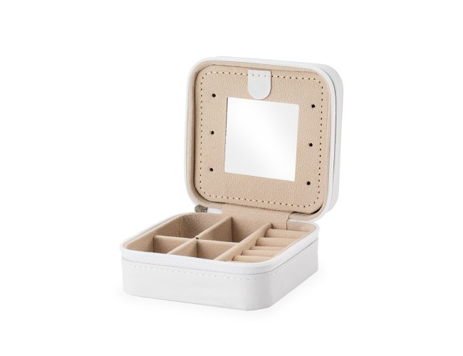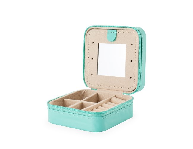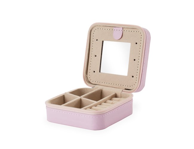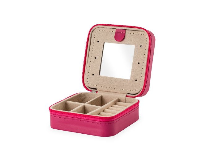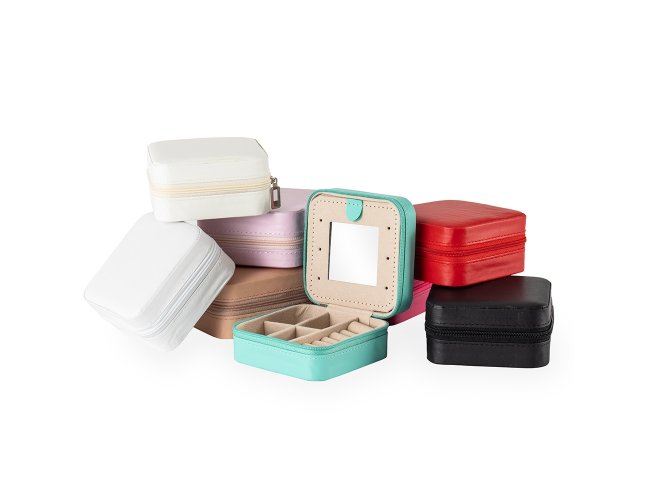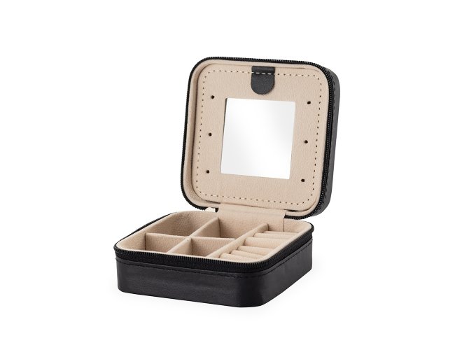 Porta-joias em couro sintético e fechamento em zíper. Conta com revestimento interno em veludo, três ganchos pequenos, um bolso interno e uma divisória com espelho na parte interior da tampa. Possui também compartimento removível com quatro divisórias e almofadas fixas para anéis. Apresenta marcas visíveis de cola no revestimento interno.