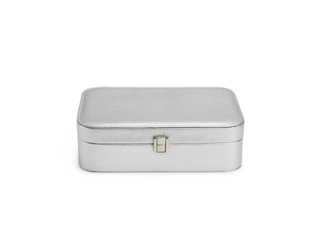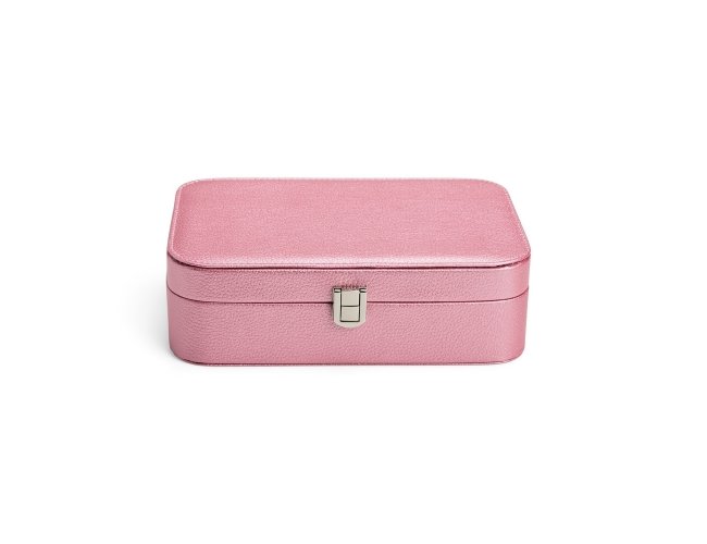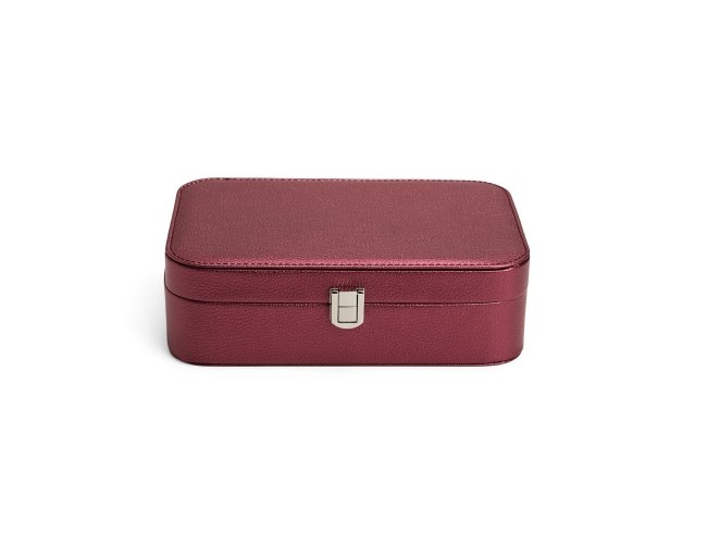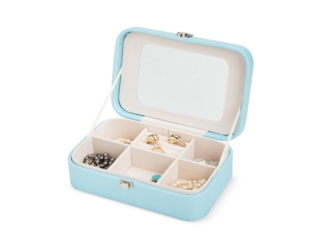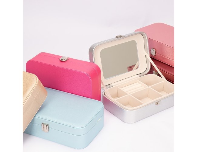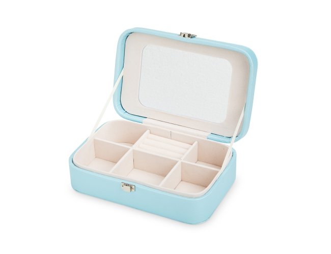 Porta-joias em poliuretano (PU) e revestimento interno aveludado. Apresenta, em seu interior, um espelho fixo e mais seis divisórias, incluindo uma repartição almofadada com ranhuras para guardar anéis. Além disso, o estojo possui trava de segurança para fechamento.