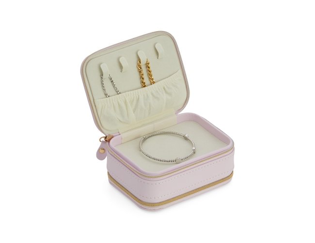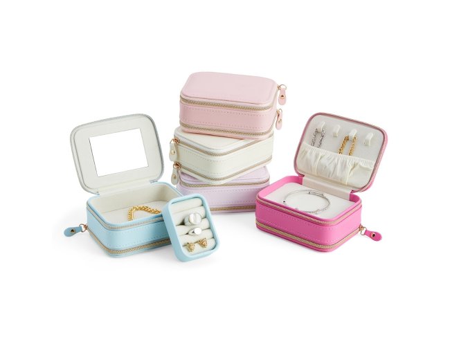 Porta-joias de couro sintético com dois compartimentos de revestimento aveludado. Possui compartimento para anéis, brincos, pulseiras e colares.