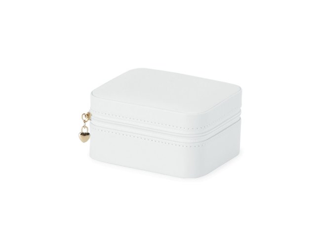 Porta-joias de couro sintético com revestimento aveludado. Possui compartimentos internos para anéis, brincos, pulseiras e colares.