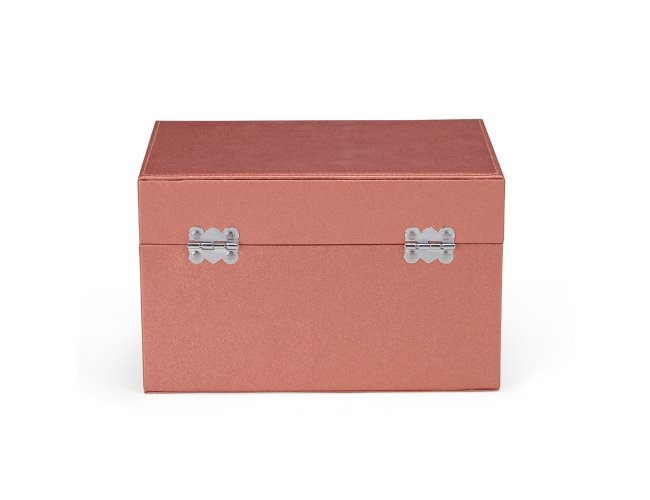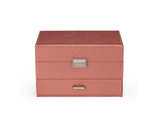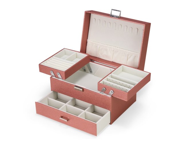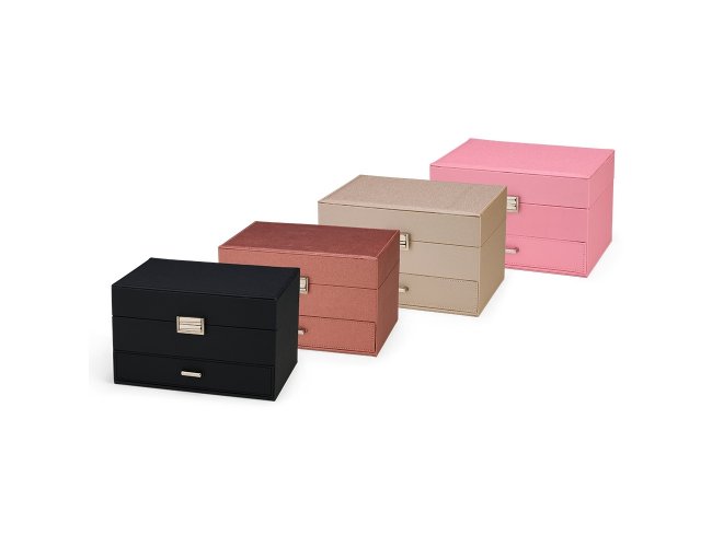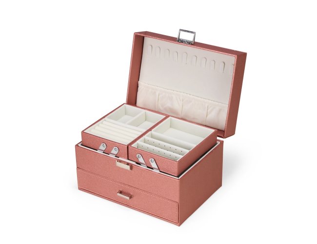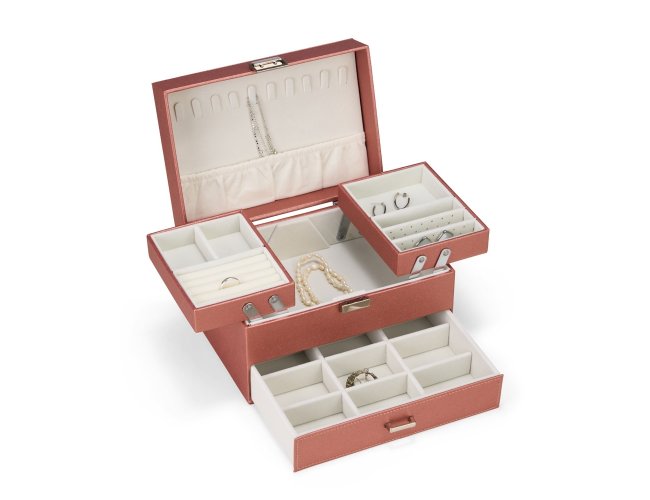 Porta-joias em couro sintético com trava de fechamento em metal e uma gaveta com puxador e divisórias removíveis. Possui revestimento interno em veludo, além de dez ganchos e um bolso com elástico na parte interna da tampa. Apresenta ainda duas bandejas móveis com divisórias de tamanhos diferentes, permitindo a organização de itens variados.