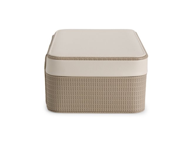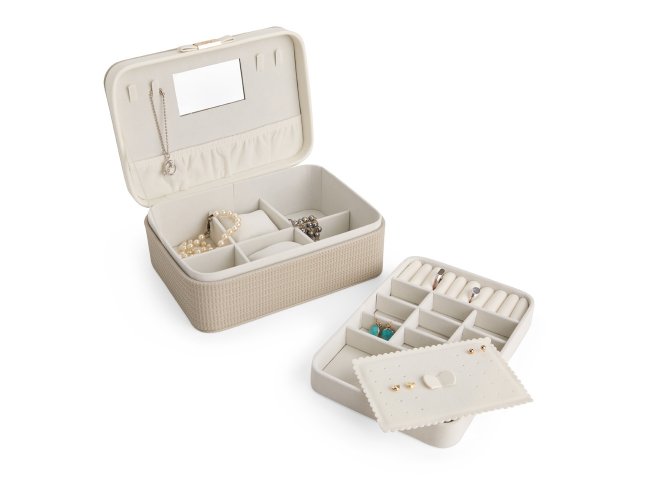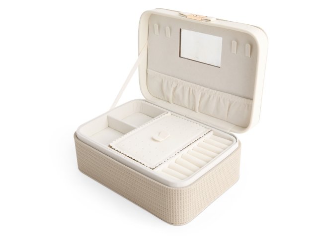 Porta-joias em couro sintético texturizado, com detalhe frontal em metal e revestimento interno em veludo. No interior da tampa, apresenta quatro ganchos, um bolso com elástico e um espelho de formato retangular. Possui dois compartimentos principais: o superior, removível, com 12 divisórias em diferentes tamanhos, que também inclui uma tampa protetora para as divisórias centrais; e o inferior, com divisórias removíveis e duas almofadas.