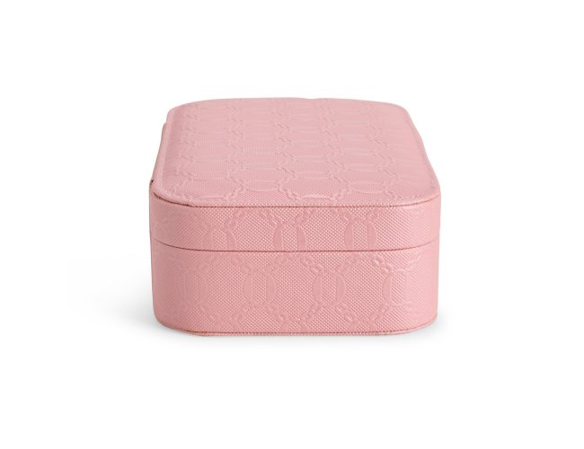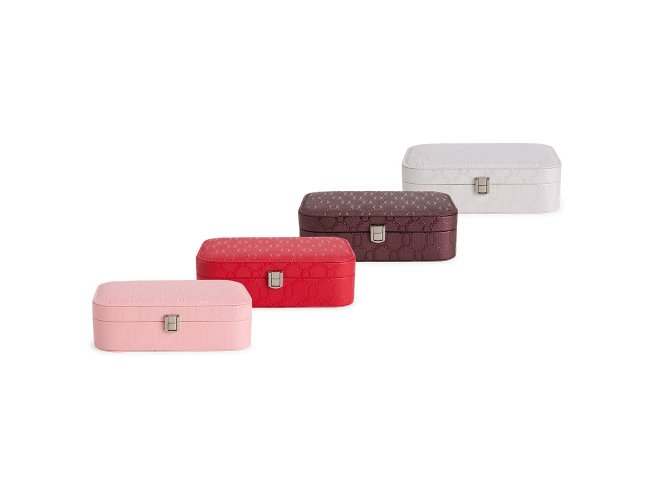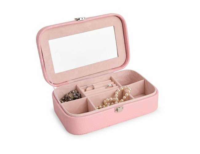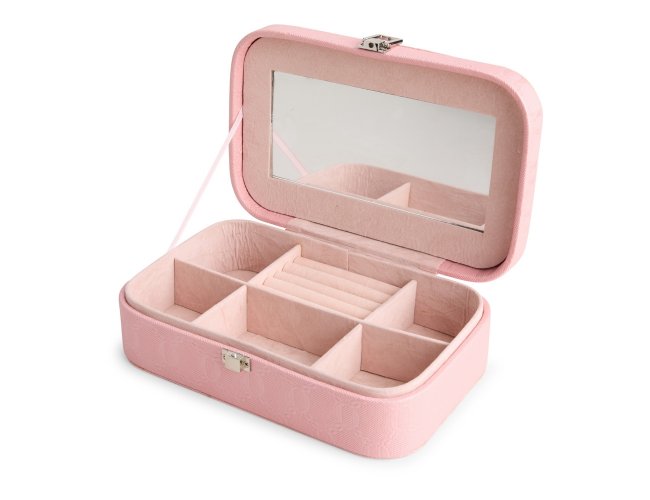 Porta-joias em couro sintético com detalhes texturizados e trava de segurança para fechamento. Possui revestimento interno aveludado, um espelho retangular fixo e seis compartimentos em tamanhos diferentes, incluindo divisória com almofadas para guardar anéis e brincos.