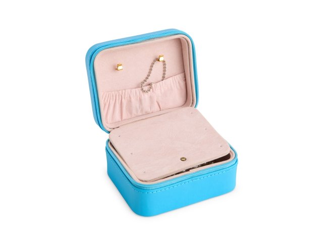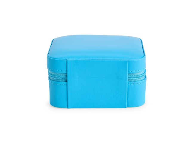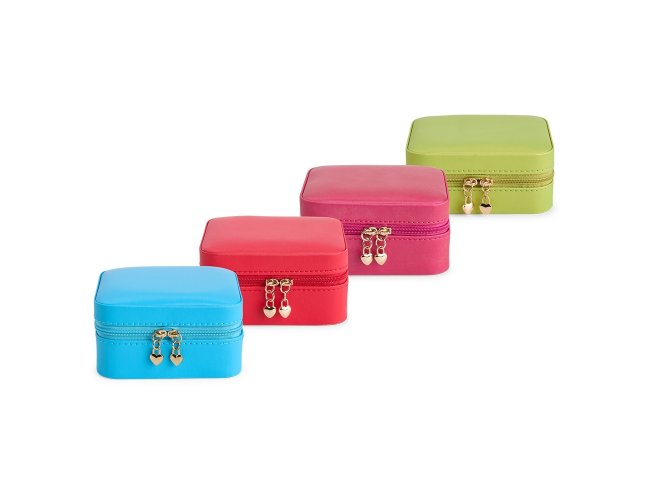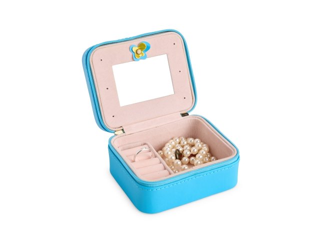 Porta-joias em couro sintético de textura lisa com revestimento interno aveludado e fechamento em zíper com puxadores no formado de coração. Possui compartimento principal com divisória almofadada para anéis e brincos, além de dois ganchos e um bolso com elástico no interior da tampa, além de um espelho retangular na parte central do estojo.