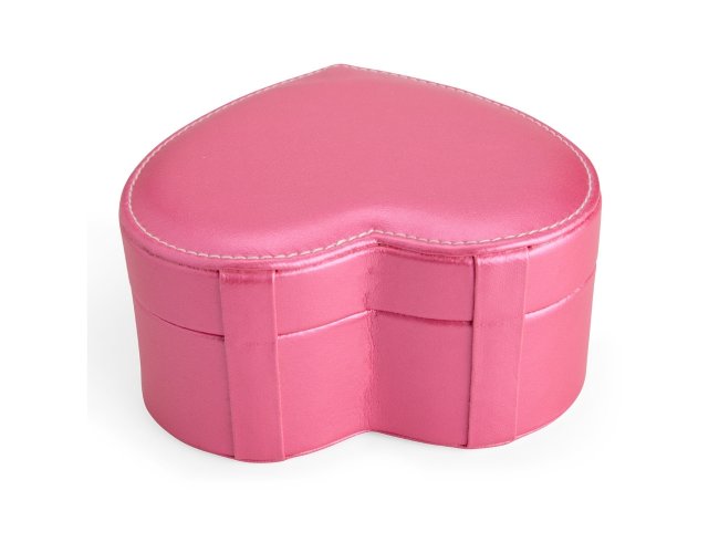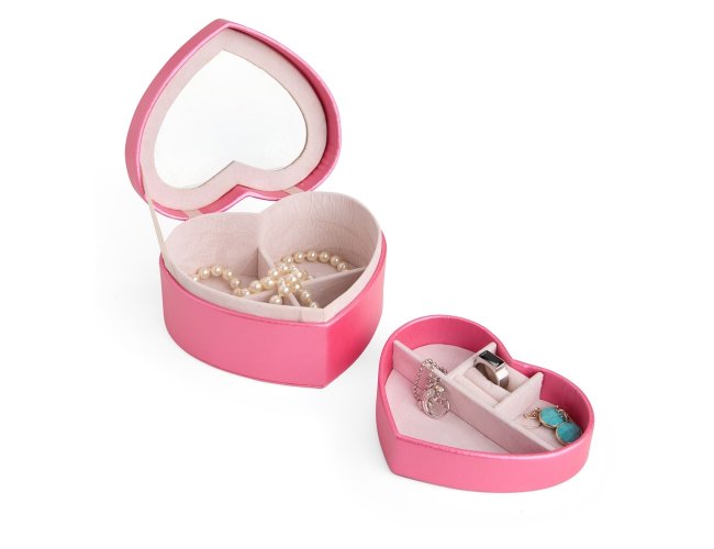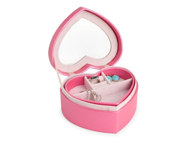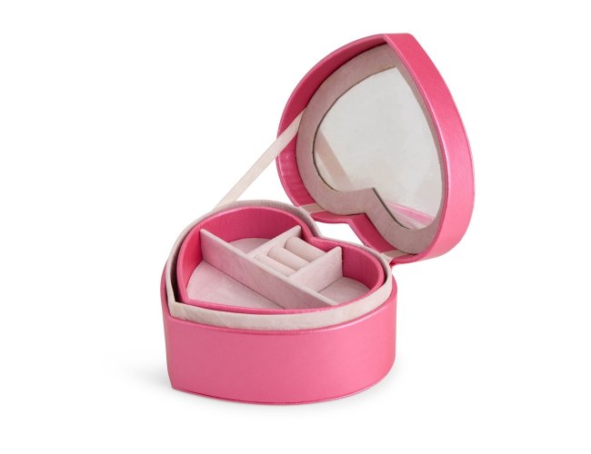 Porta-joias em couro sintético com formato de coração e revestimento interno aveludado. Conta com espelho interno e dois compartimentos principais: o superior, removível, com quatro divisórias em diferentes tamanhos, uma delas com almofadas para abrigar anéis e brincos; e o inferior, com mais quatro divisórias.