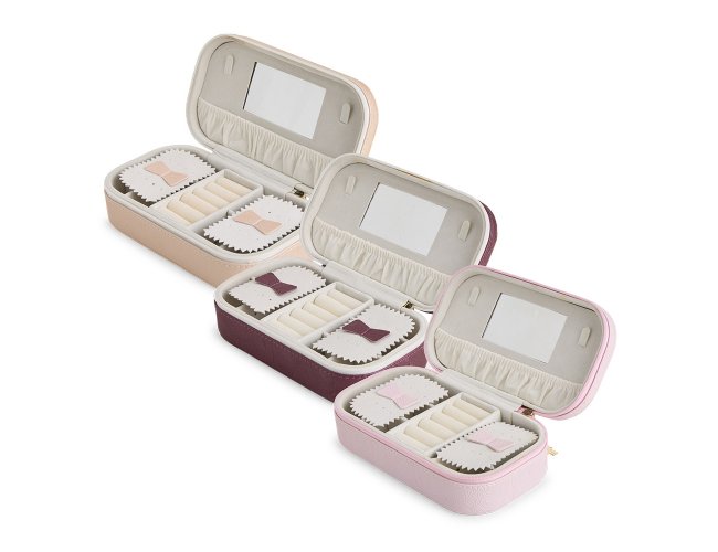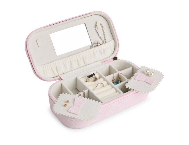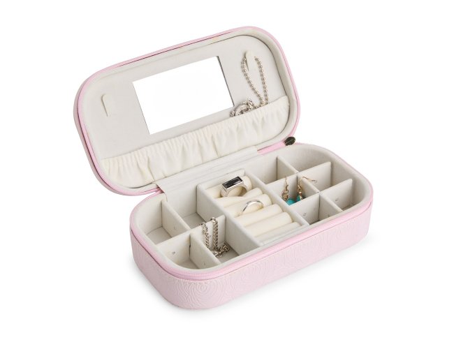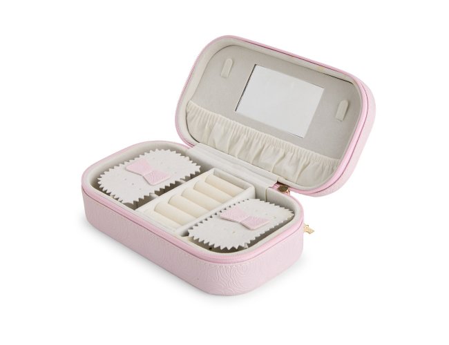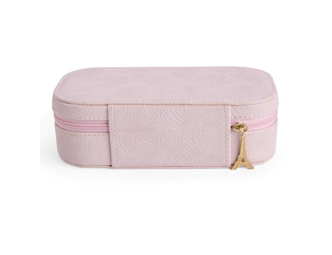 Porta-joias em couro sintético e fechamento em zíper com puxador que remete ao formato da torre Eiffel. Possui revestimento interno aveludado, espelho retangular fixo, dois ganchos e bolso posicionados na parte interna da tampa, além de divisórias removíveis no compartimento principal e outra com almofadas para anéis e brincos.