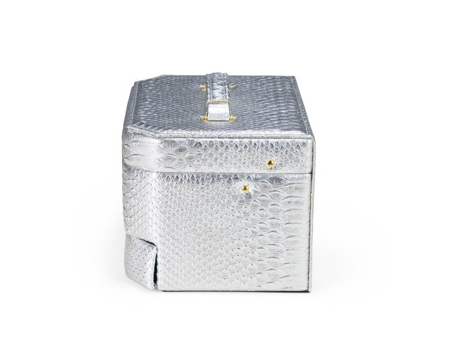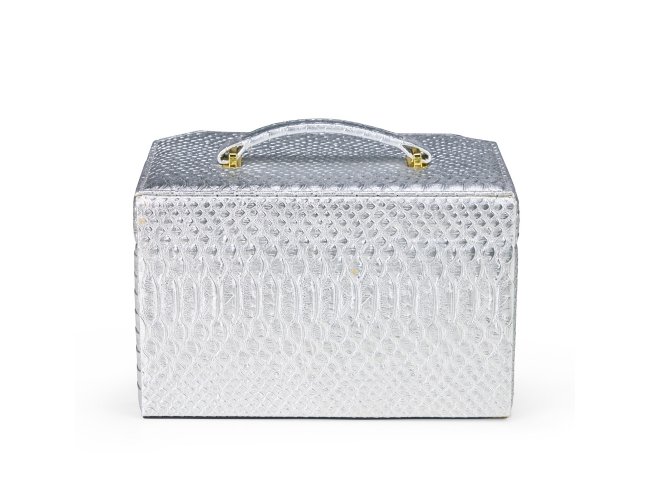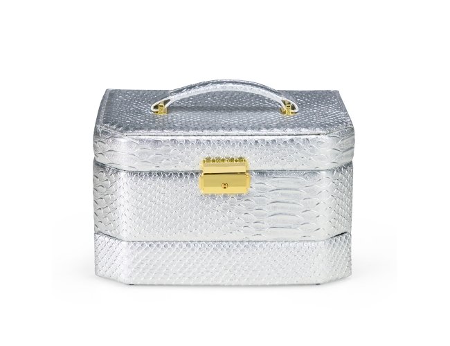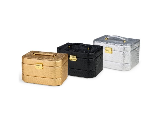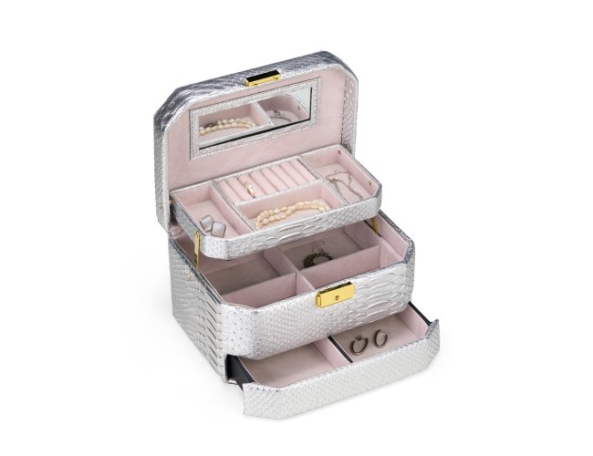 Maleta porta-joias em couro sintético com textura crocodilo, espelho interno e trava de fechamento. Possui sistema de abertura articulado que posiciona os três compartimentos principais em formato de escada, facilitando a organização dos objetos nas divisórias de revestimento aveludado.
