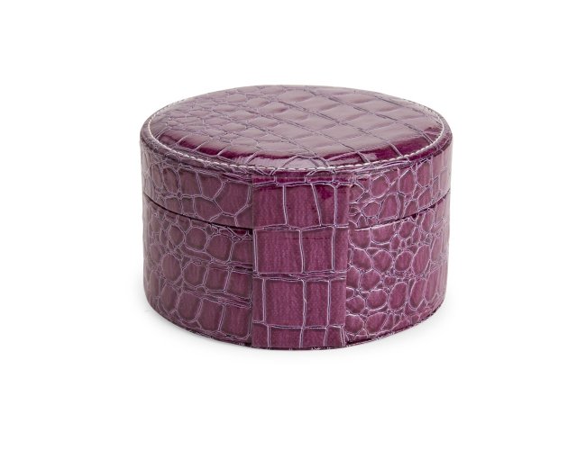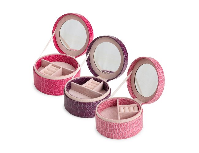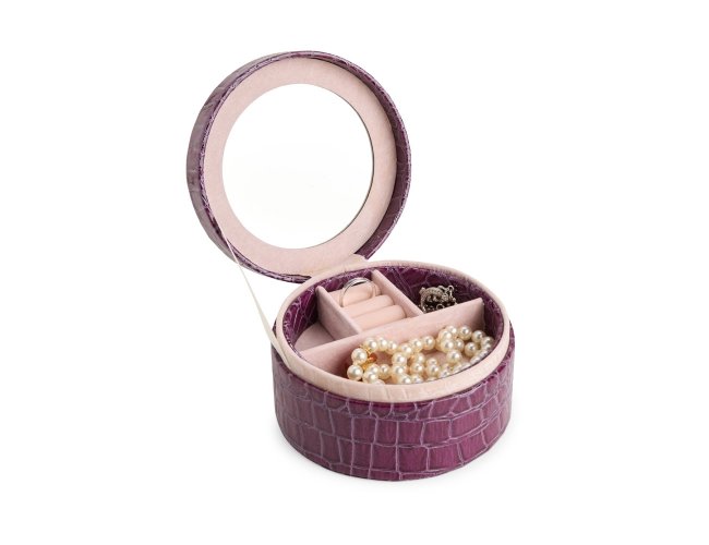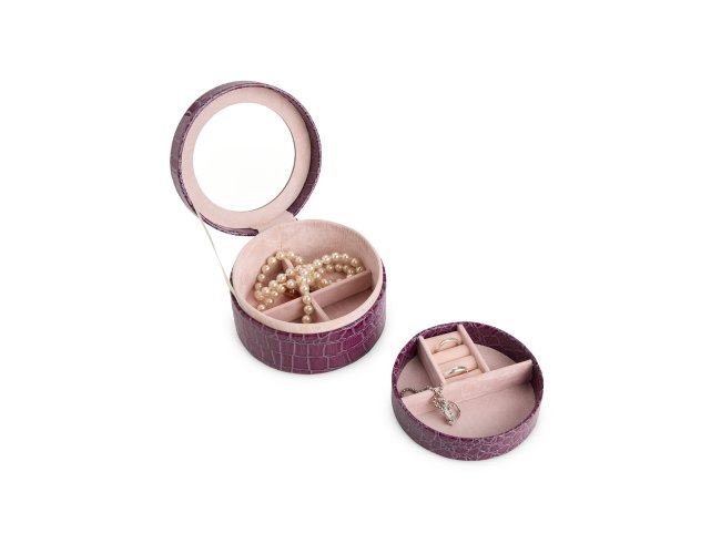 Porta joias em couro sintético com textura de crocodilo e formato arredondado. Conta com espelho no interior da tampa, além de dois compartimentos principais: o superior, removível, com quatro divisórias em diferentes tamanhos, uma delas com almofadas para abrigar anéis e brincos; e o inferior, com mais quatro divisórias.