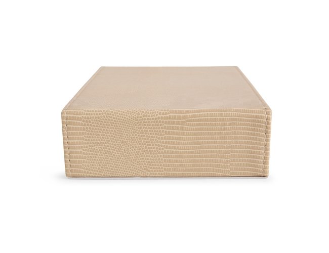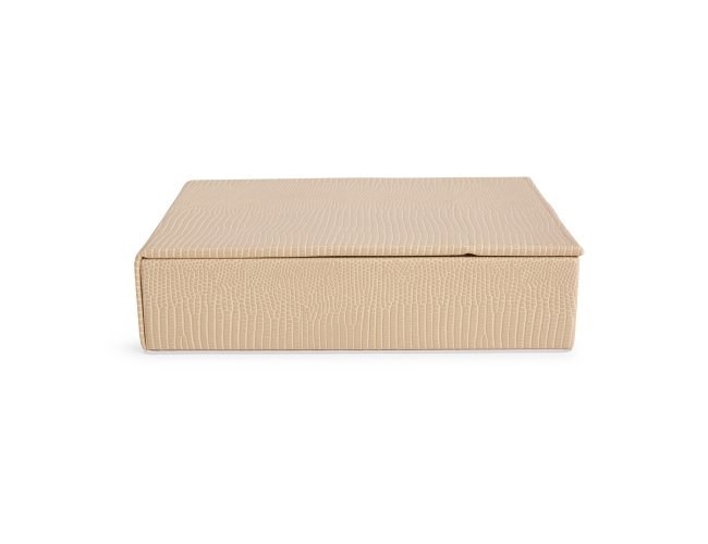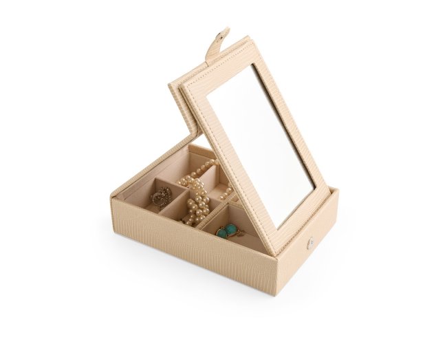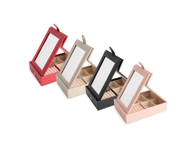 Porta-joias em couro sintético texturizado com fechamento por botão magnético. Possui um espelho retangular fixo à uma aba na tampa articulada do estojo, oferecendo opções de ajuste de inclinação. Dispõe também de revestimento interno aveludado e seis divisórias em tamanhos variados, sendo um deles com almofadas para anéis e brincos.