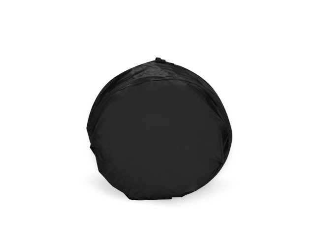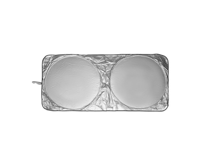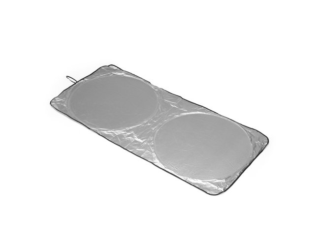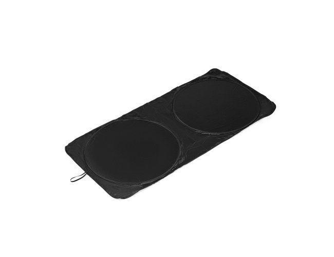 Protetor solar dobrável para para-brisa, confeccionado em tecido leve e com estrutura flexível. Possui alça lateral elástica para facilitar o manuseio.