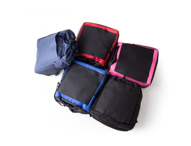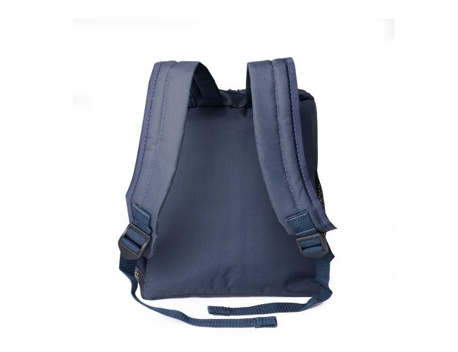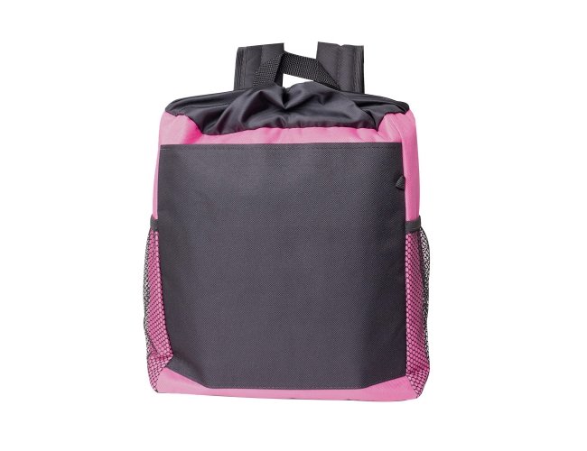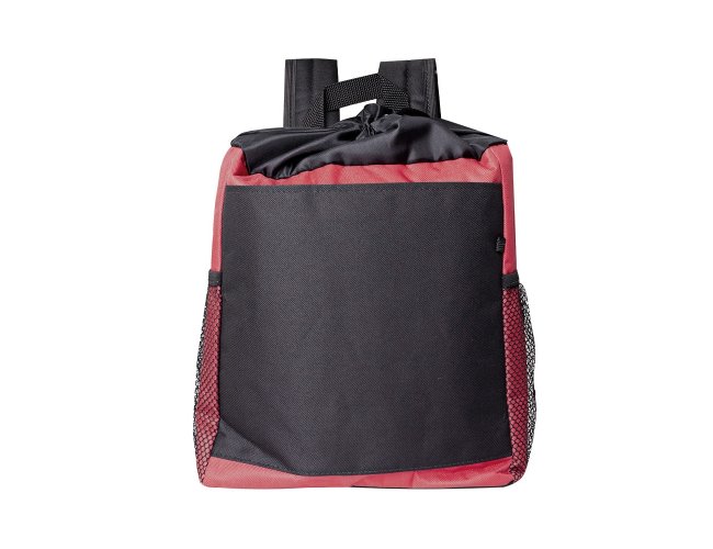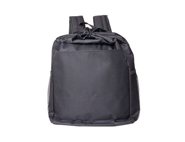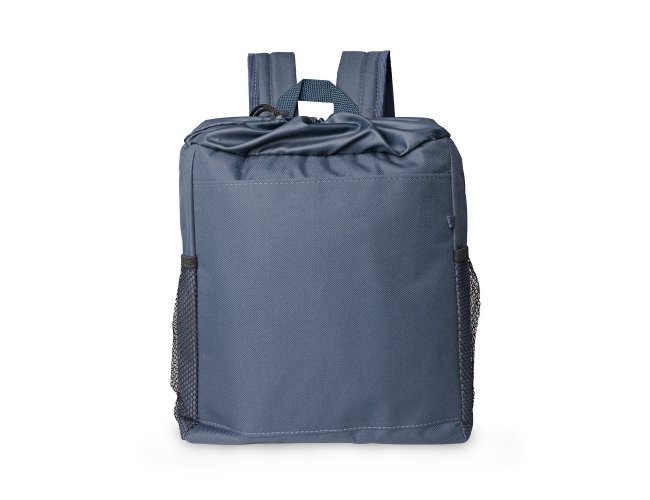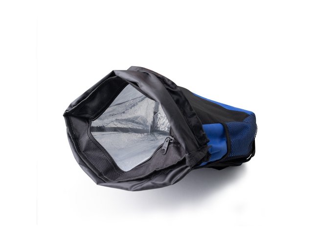 Sacochila térmica de nylon, com capacidade de 14 litros com compartimento de saco antivazamento, bolso frontal e bolsos de tela nas laterais.