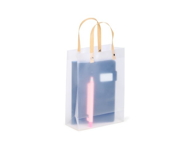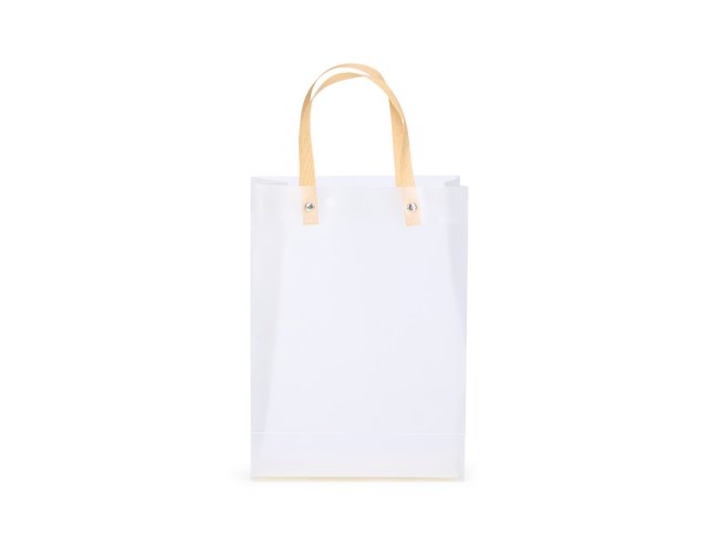 Sacola plástica com formato retangular, acabamento fosco e alças em papelão fixadas por botões metálicos.