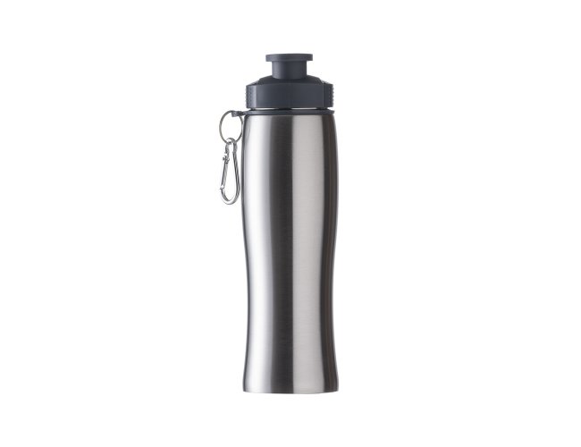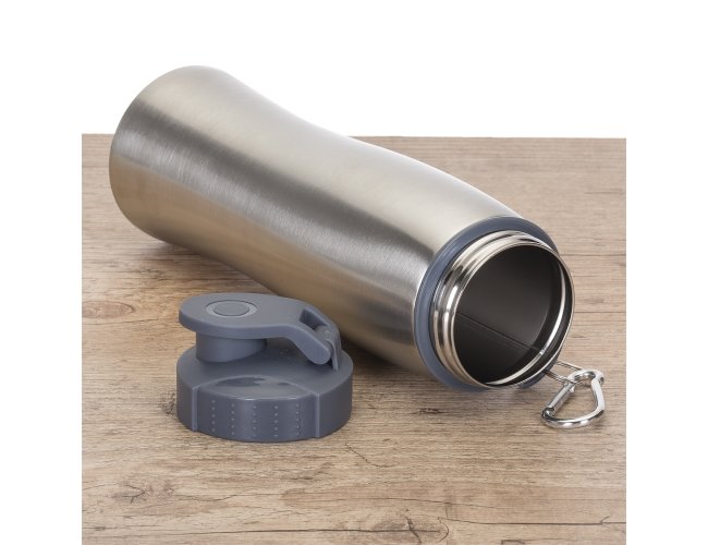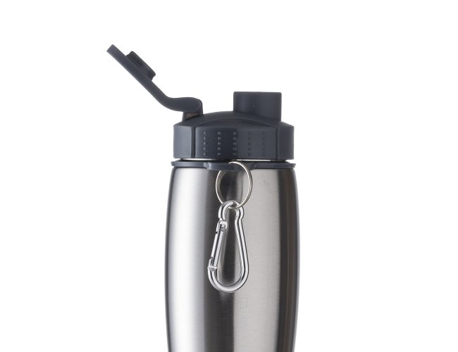 Squeeze inox 750ml com tampa plástica rosqueável e abertura superior, acompanha mosquetão. Tem a parte inferior emborrachada.