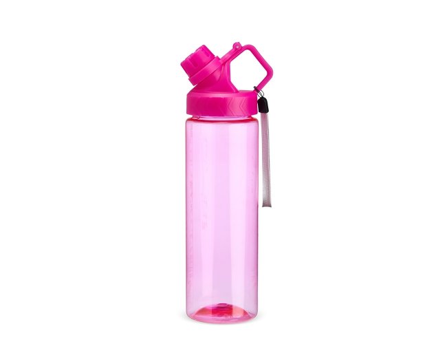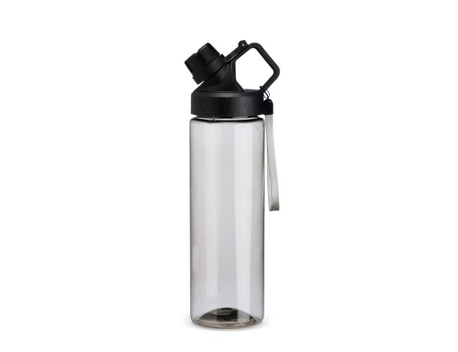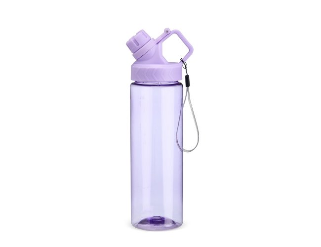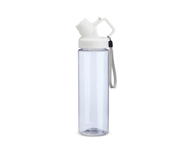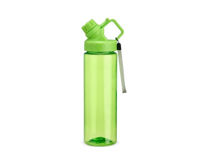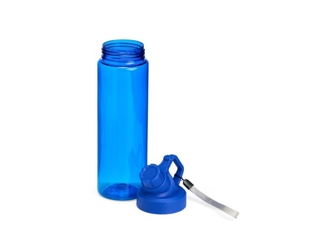 Squeeze plástico com capacidade para até 750ml. Possui tampa rosqueável com protetor de bocal e alça fixa para transporte. Acompanha cordão de nylon para prender à alça da tampa.
