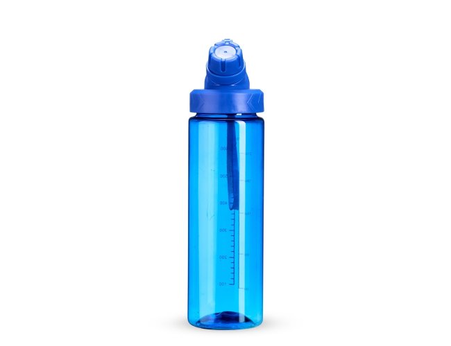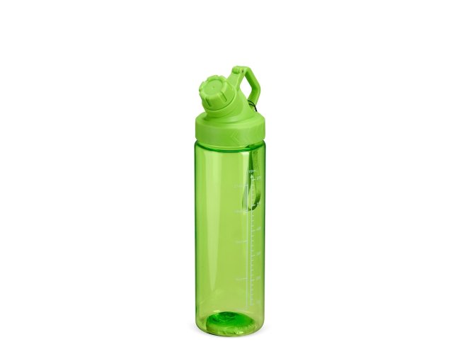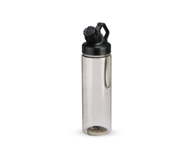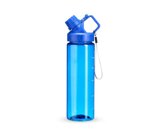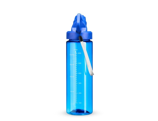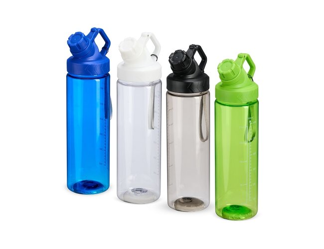 Squeeze plástico livre de BPA, com capacidade máxima de 750ml e marcação de volume de 700ml impressa no corpo. Dispõe de bocal plástico com protetor rosqueável para o bocal e alça fixa. Acompanha cordão de nylon para prender à alça da tampa.