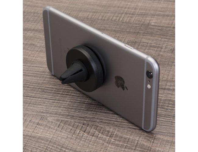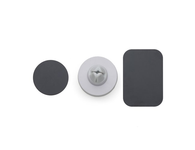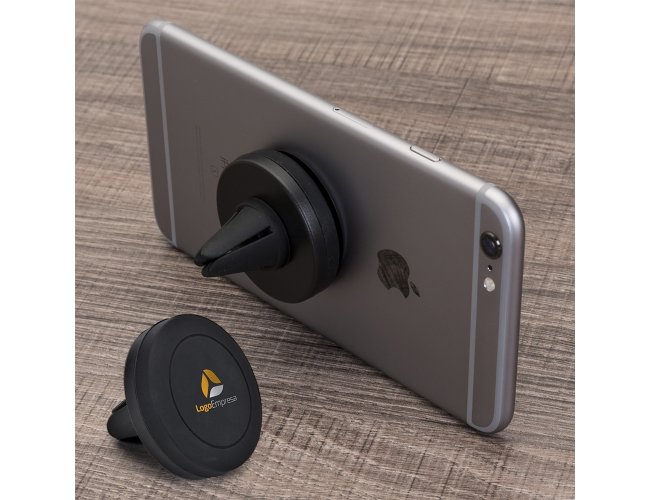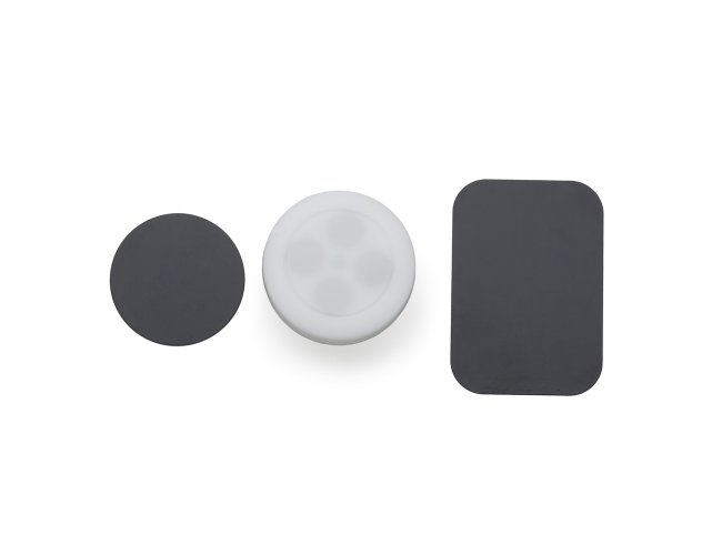 Suporte veicular magnético com quatro imãs de alta imantação e garra de encaixe. Acompanha duas fichas metálicas.