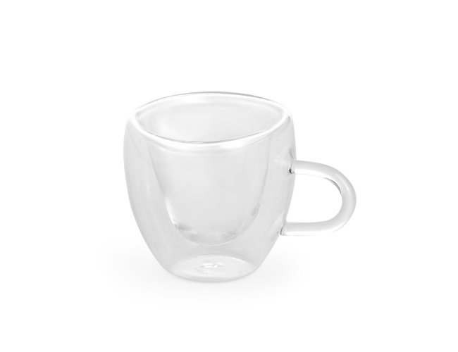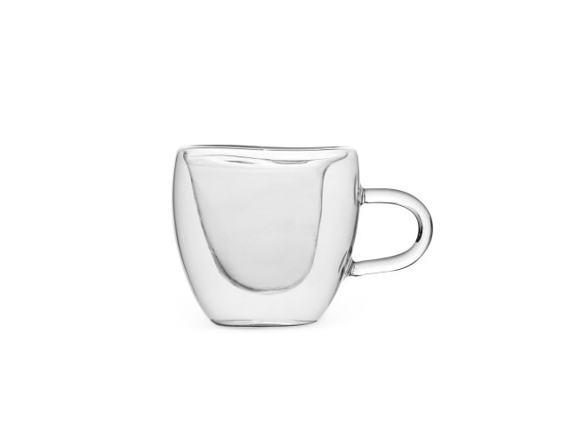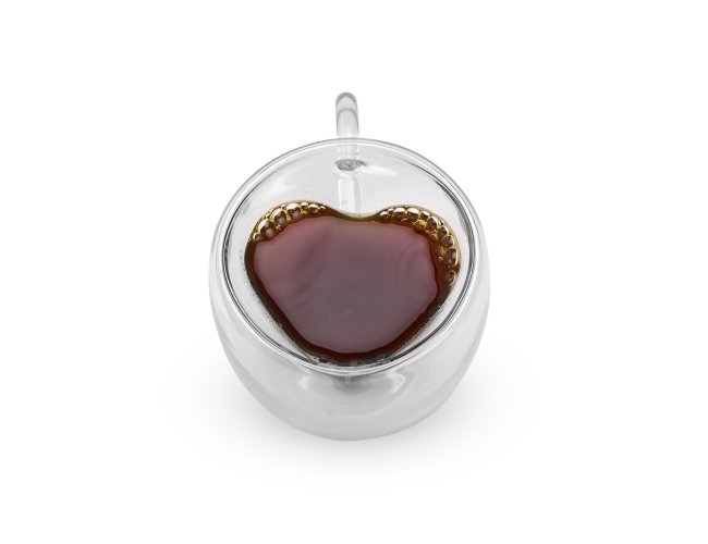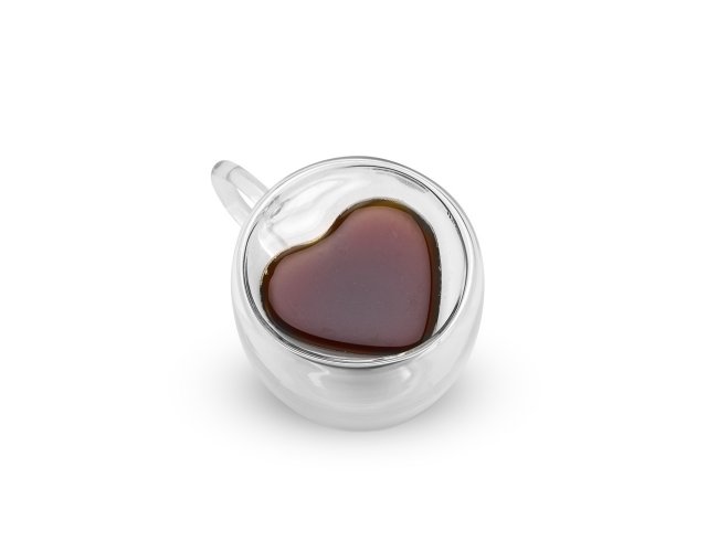 Xícara de vidro com capacidade para até 80ml. Possui contorno interno em formato de coração e estrutura de parede dupla que ajuda a impedir que a temperatura de líquidos entre em contato com a parte externa.